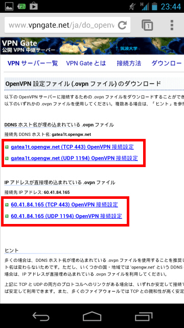 OpenVPN Connect のインストールが完了している場合は、Android の画面上で 公開 VPN 中継サーバー一覧ページ を開き、.ovpn ファイルを直接ダウンロードしてインポートすることができます。
