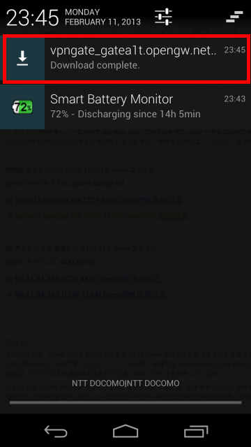 また、パソコン上で公開 VPN 中継サーバー一覧ページ を開き、.ovpn ファイルをダウンロードしてから、それをメールに添付して Android に送信する方法でもインポートできます。