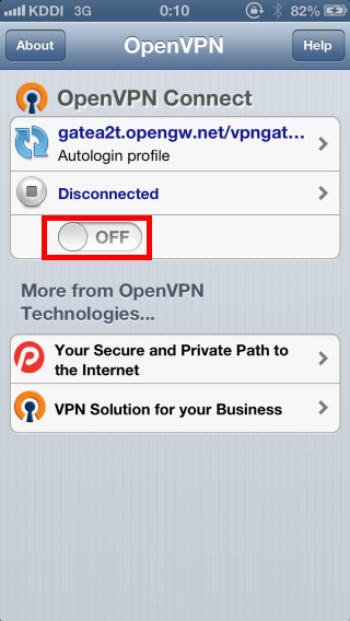 VPN 接続を行うには、OpenVPN Connect を起動し、すでにインポート済みの .ovpn ファイルを選択して「OFF」ボタンをクリックします。