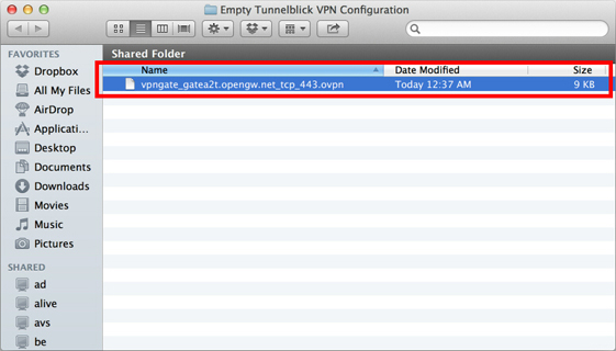 この接続設定ファイル (.ovpn ファイル) を、先ほど作成されたデスクトップ上にある「Empty Tunnelblick VPN Configuration」という名前のフォルダにコピーまたは移動します。