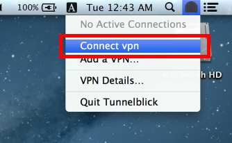 Mac OS X の画面の右上に表示されている Tunnelblick のアイコンをクリックし、「Connect vpn」 ("vpn" の部分は事前に作成した接続設定フォルダ名) をクリックすると、VPN 接続を開始することができます。