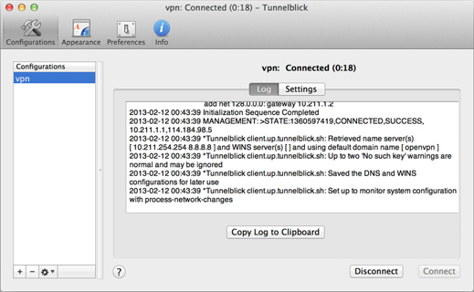 上記の操作により、Tunnelblick に OpenVPN の接続設定ファイル (.ovpn ファイル) がインポートされました。